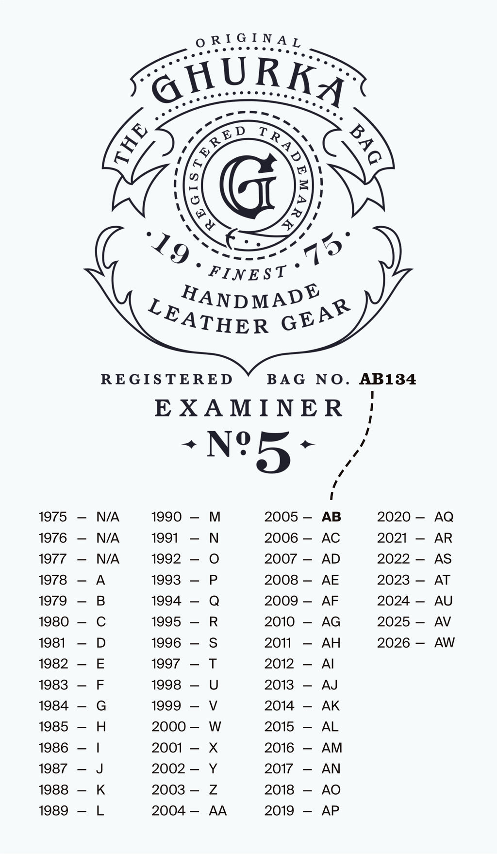 Each Ghurka bag has a unique alphanumeric registration number. The first 1-2 letters indicate the year of production, with A - AU corresponding to 1978 - 2024. The number that follows represents the bag’s position in the production sequence for that specific style and color/material.